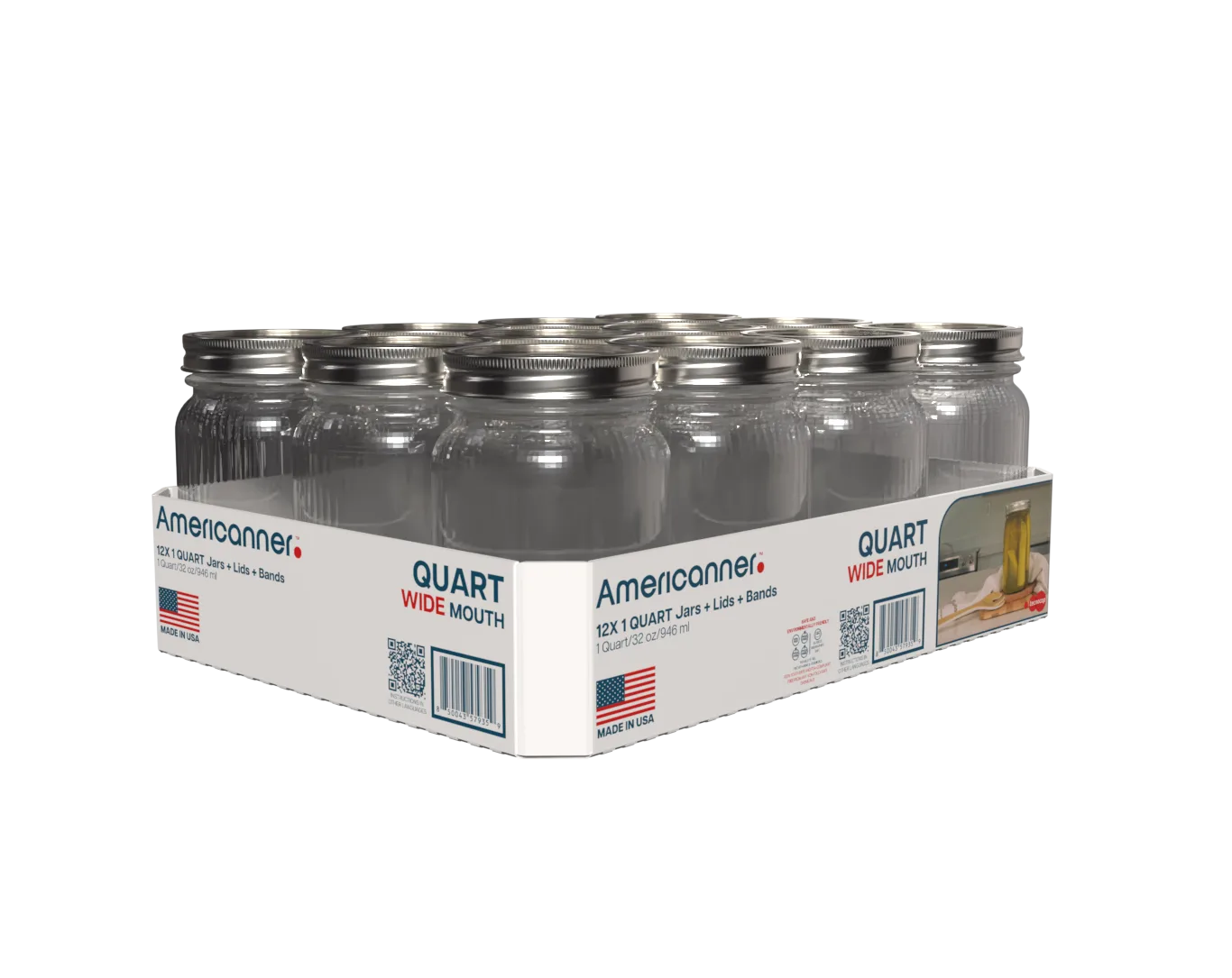 Wide Mouth Quart jars with smooth sides, traceable glass, and gasket-ready lids and bands. Ideal for large preserves, sauces, or dry goods.